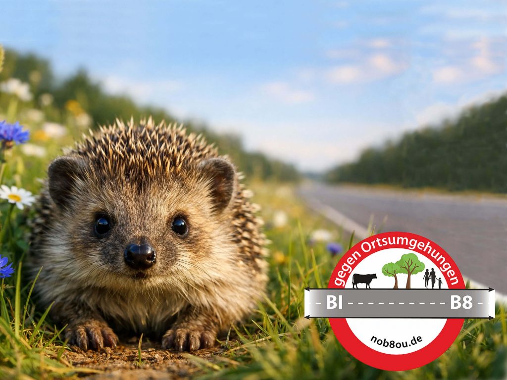 An vier bis sechs geeigneten Standorten werden entlang der B8 große, stabile Banner aufgestellt, die unser Ortsschild-Motiv sowie Tiere zeigen, die durch Ortsumgehungen